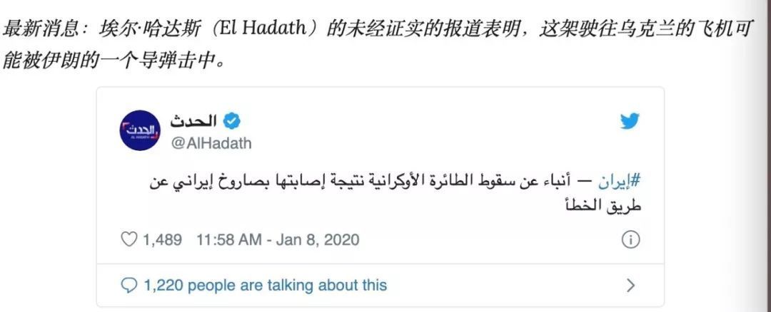 事發后,有外媒援引約旦媒體AL Hadath報道稱,失事的烏克蘭波音客機疑似遭到伊朗機管局擊落。