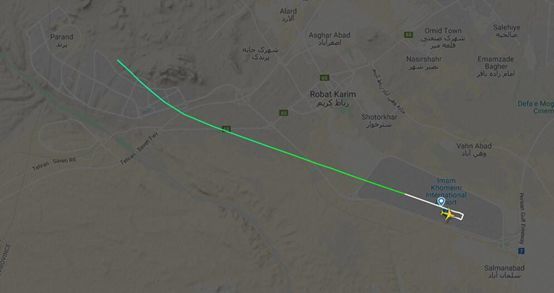 先看圖的第一部分放大,我們可以看到如下情況,這架飛機先從德黑蘭霍梅尼機場跑道下方滑行道向右側跑道端頭滑行,經過短暫運行后,運動到跑道的最東部端頭,然后向西滑跑飛行,正常起飛離地,直線向前飛行,經過1分30秒飛行后,飛機逐步向東轉向,并保持直線飛行,但是30秒時間,飛行軌跡消失,飛機墜毀,機上人員全部喪生。