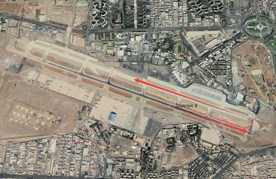 我們從谷歌地球上下載伊朗德黑蘭霍梅尼機場的布局圖,可以看到,下方是機場停機區,上方是機場跑道,中間是滑行道,從機場布局圖,我們可以看到這架烏克蘭波音737-800飛機的機場運行軌跡:如紅色箭頭所示,飛機先從停機坪緩慢滑行到滑行道上排隊,最終從飛機跑道從東向西起飛,飛機跑道長度4公里,這架波音飛機,正常起飛滑跑在2公里左右,跑道足夠長,可以起降世界最大的波音747和空客A380一類巨型客機,這是伊朗的首都機場,跑道足夠長,停機坪面積足夠大,召開國際會議,迎接世界各國首腦訪問所必須。